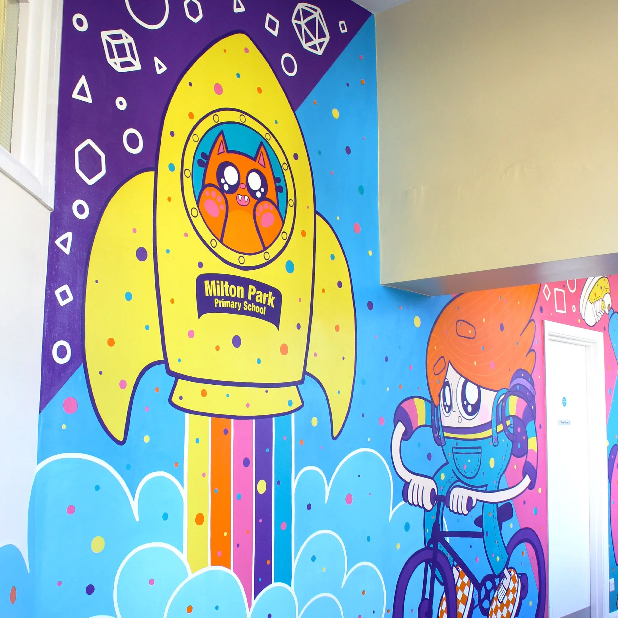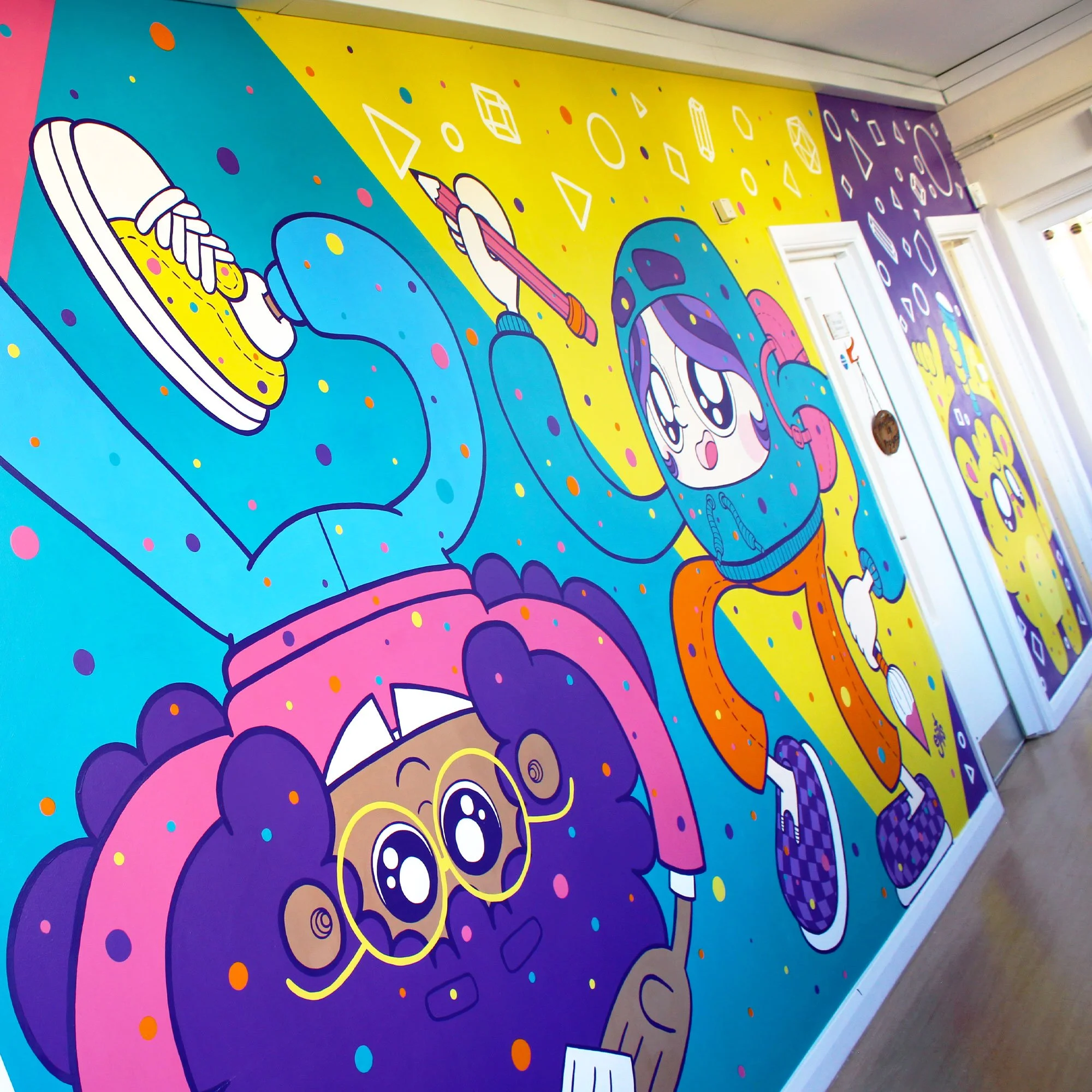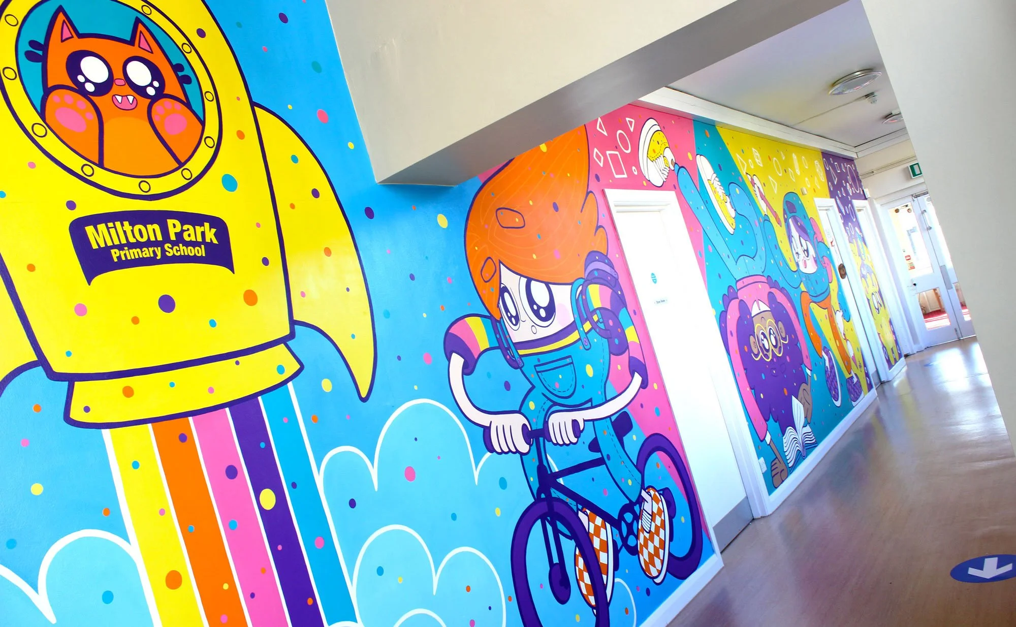 This mural was created for a Primary School in Weston-super-Mare. The brief was to incorporate themes from their motto ‘Everyday a Learning Adventure’ which as someone who is a fan of adventure stories and games that was a dream brief. The mural runs along a 13 metre entrance corridor which the kids and teachers use everyday and is a colourful welcoming to the school.