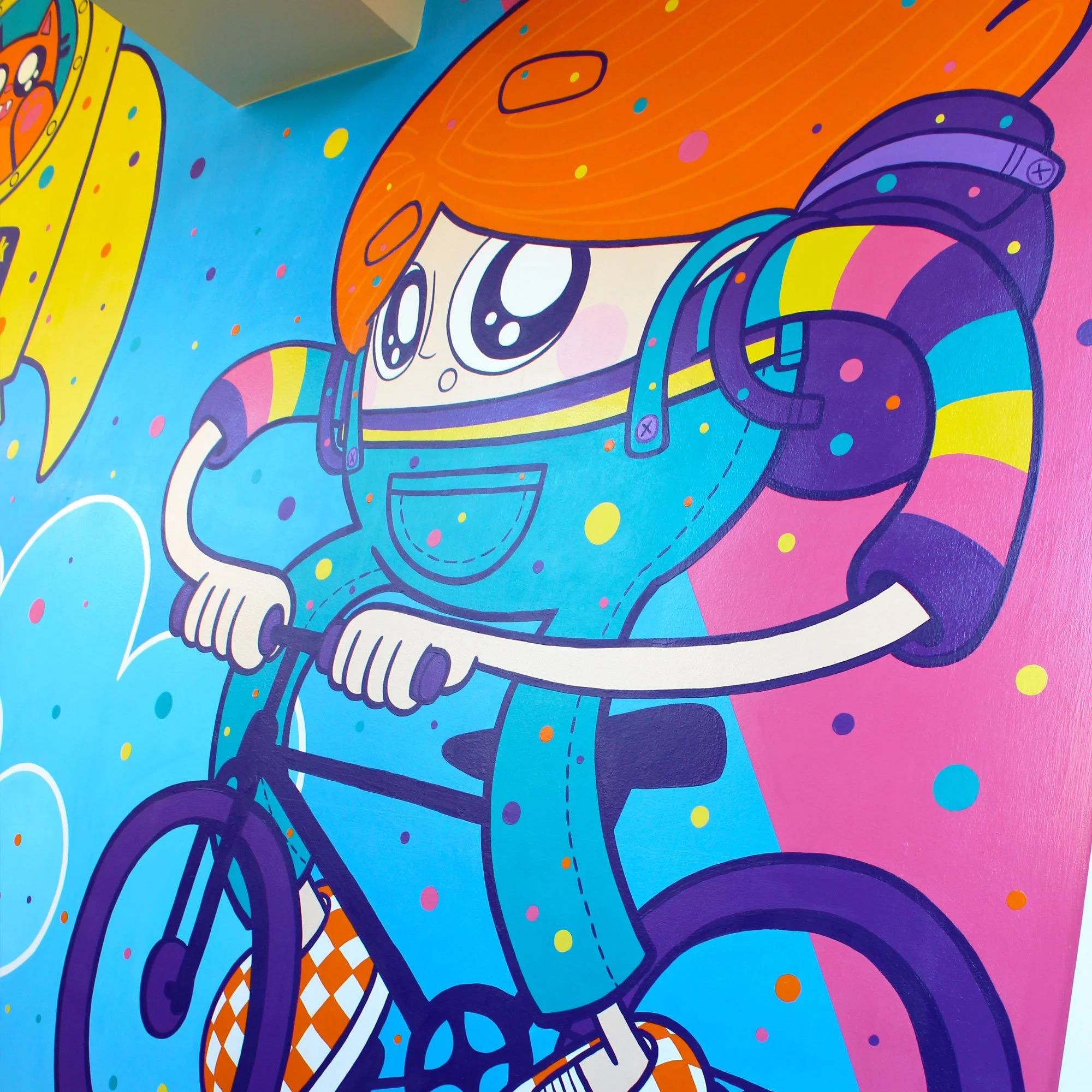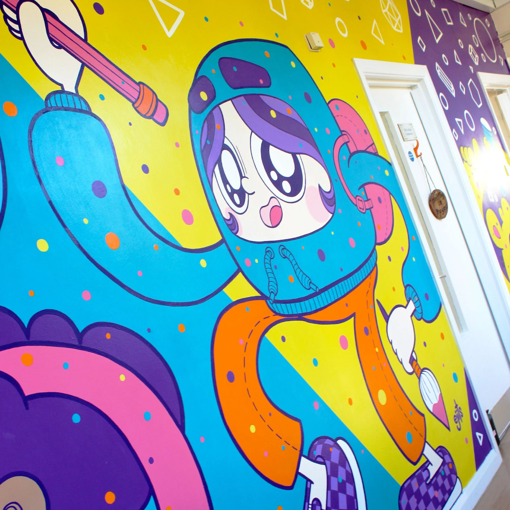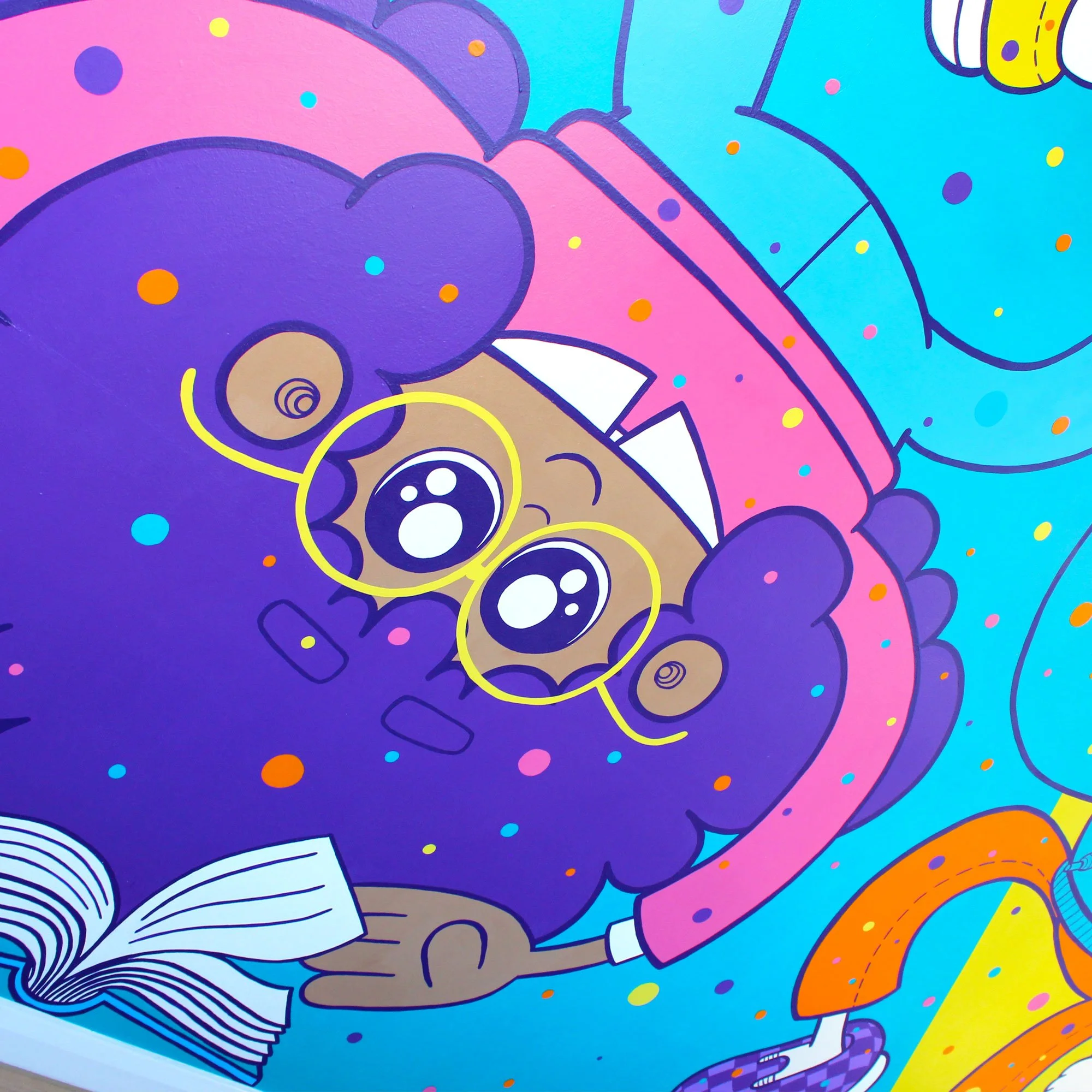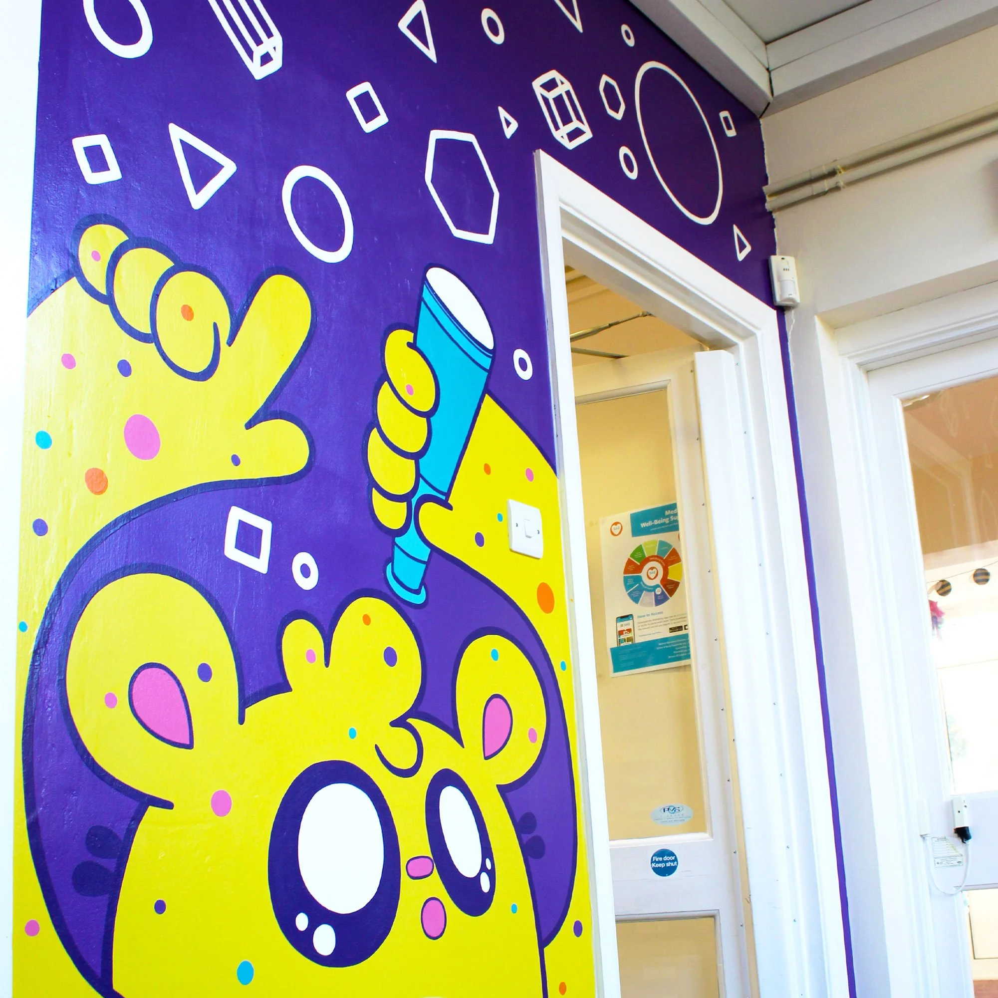 This mural was created for a Primary School in Weston-super-Mare. The brief was to incorporate themes from their motto ‘Everyday a Learning Adventure’ which as someone who is a fan of adventure stories and games that was a dream brief. The mural runs along a 13 metre entrance corridor which the kids and teachers use everyday and is a colourful welcoming to the school.